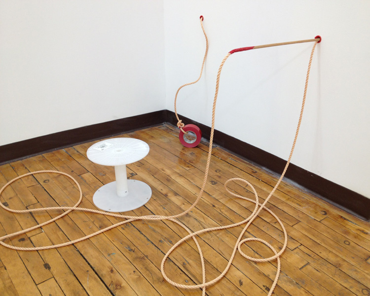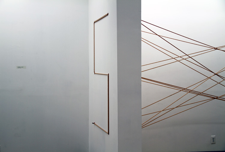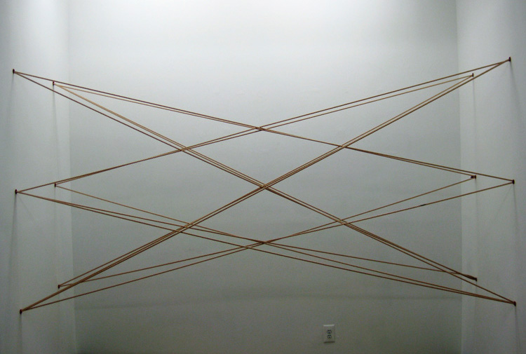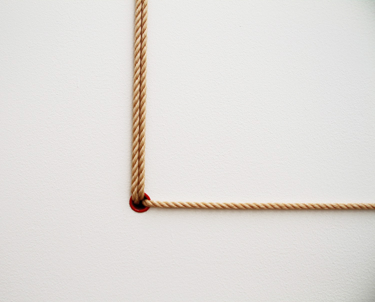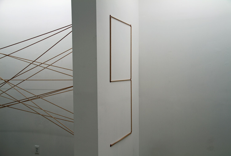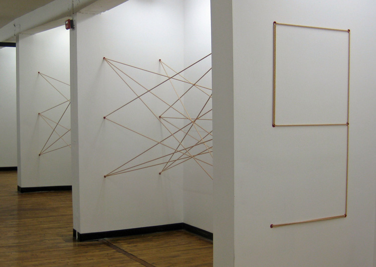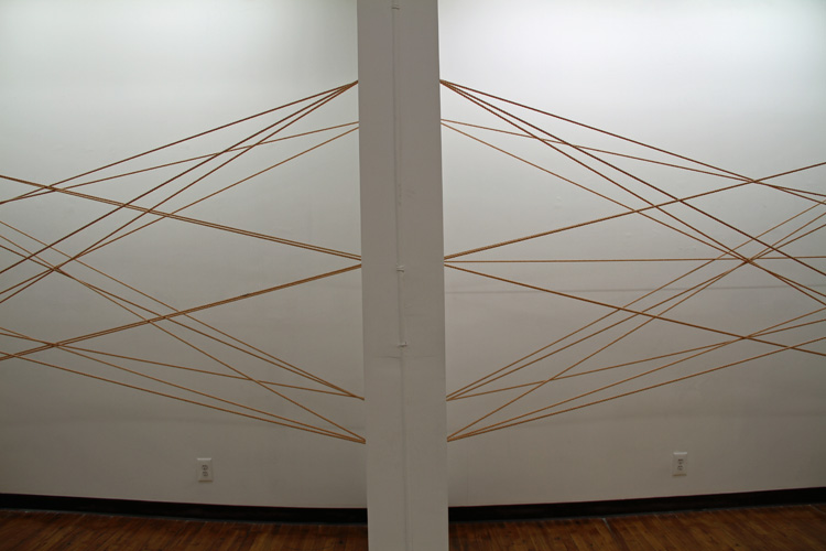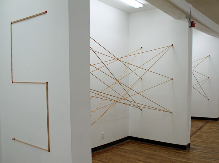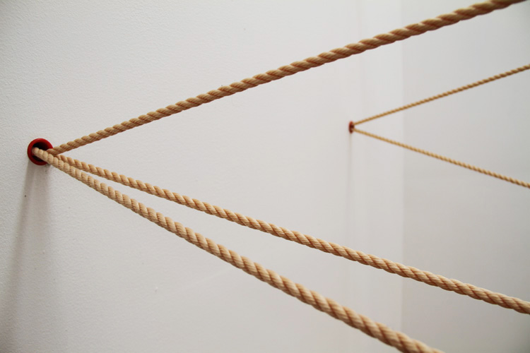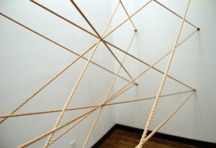 The installation consisted of three walls, approximately 10 feet apart, threaded together by 400 feet of continuous rope that stitched number 5 on the front wall and number 9 on the back wall, with a transitional wall in between. This middle wall with holes and rope traced through them looked like a sieve, separating incomposite number 5 from composite number 9. The installation Between 5 and 9 provided a visual version of the concept of The Sieve of Eratosthenes along with visual interpretation of the structured space between the abstract notions of numbers.