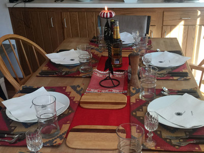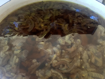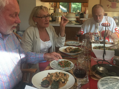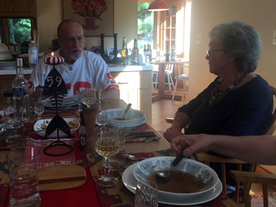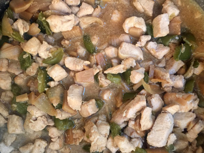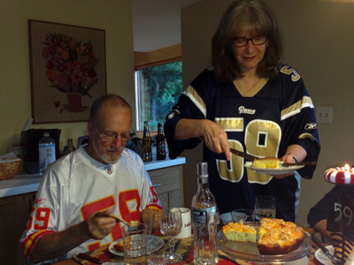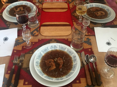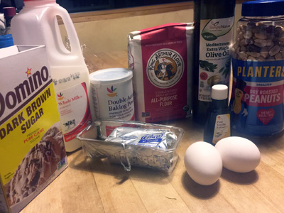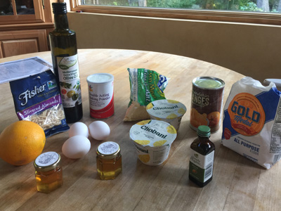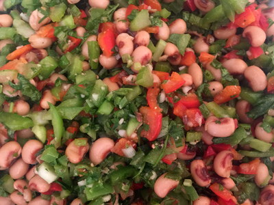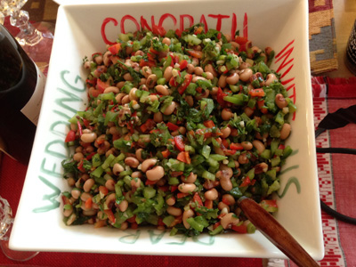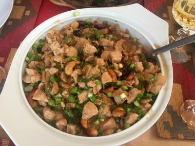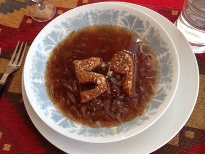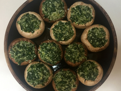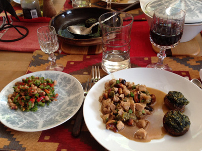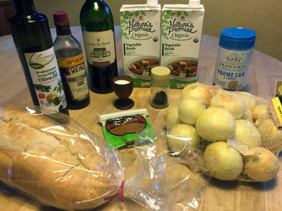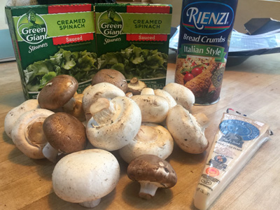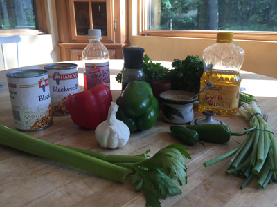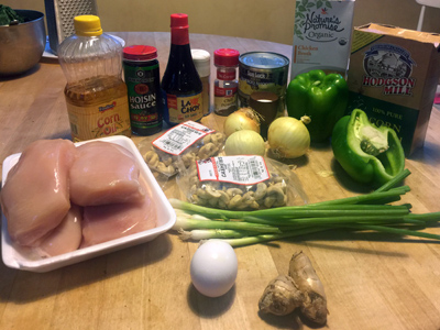 Menu: Caramelized Onion Soup, Texas Caviar, Four-Ingredient Stuffed Mushrooms, Chicken with Cashews (Szechwan Style), Citrus Cornmeal Cake, Peanut Bars.