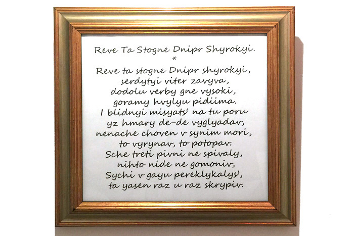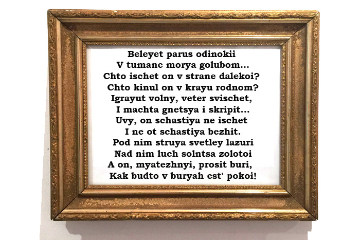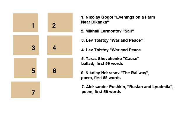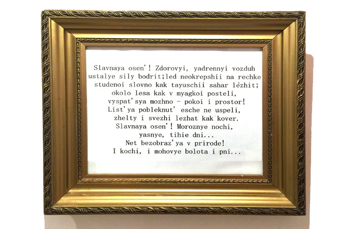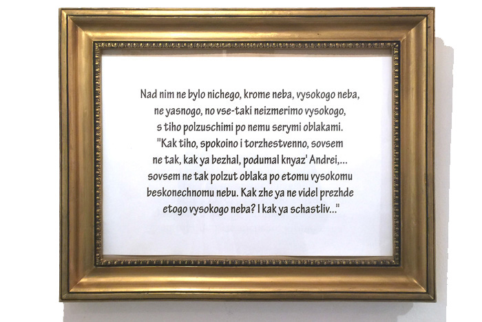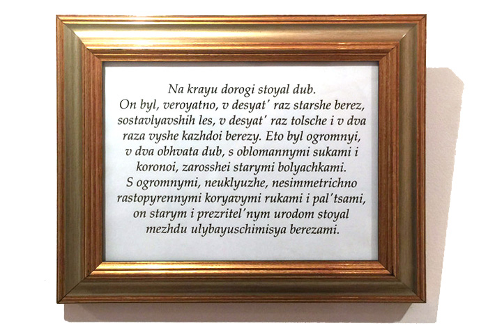 The idea for "Landscapes" was conceived before the Cyrillic script standard was developed for the internet. The Romanization of Cyrillic has been widely used in early electronic communications. Well known examples of landscape descriptions in classical Russian literature were chosen to underline the unique awkwardness of that time. During the realization of this project it was found that a very famous, learned by heart (at school) quote about the river Dnepr by Nikolai Gogol, has exactly 59 words. Word count of the renown poem "Sail" by Mikhail Lermontov returned 60 but after eliminating the only dash, had 59 words. Lev Tolstoy's famous descriptions of the "sky" and the "oak" had a few extra words that were imperceptibly extracted. These seven Landscapes were part of the exhibition Qui Pro Quo, OkNo Gallery, Chelyabinsk, Ural region, Russia, Fall of 2017.