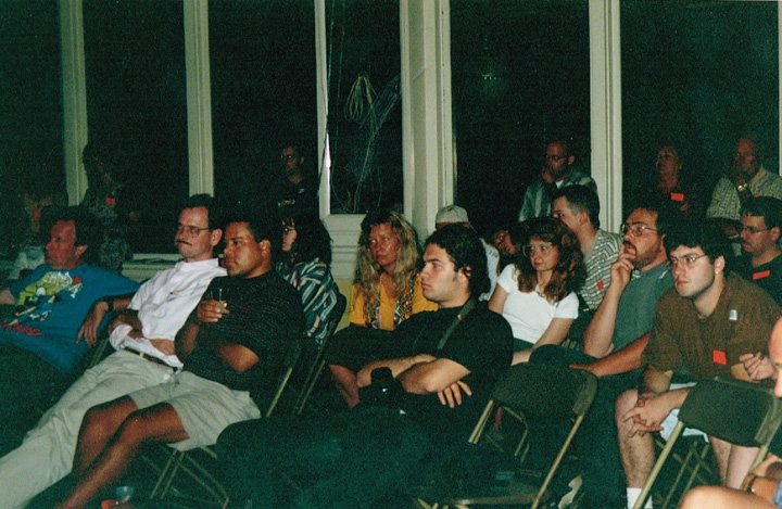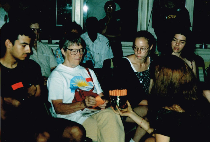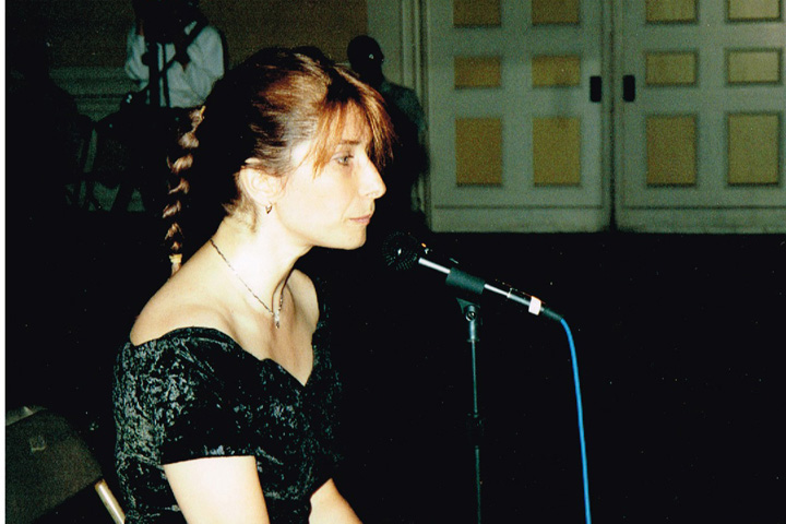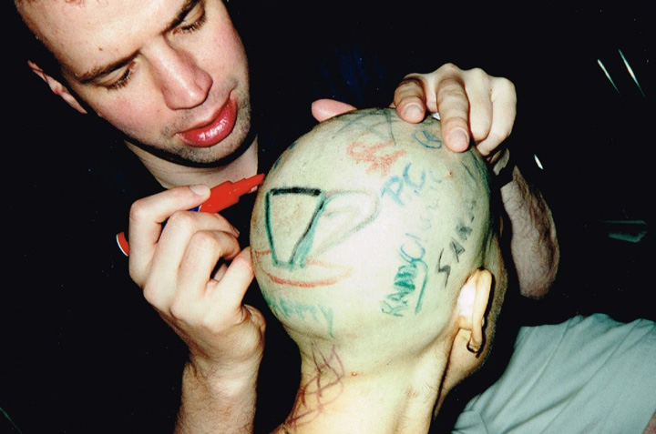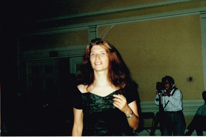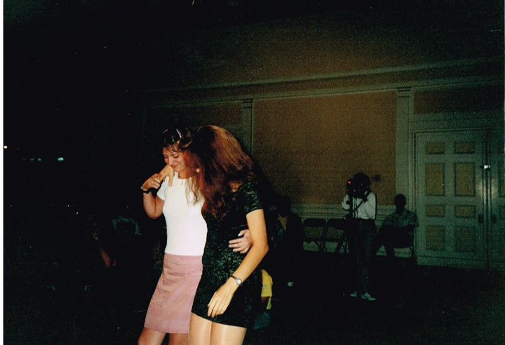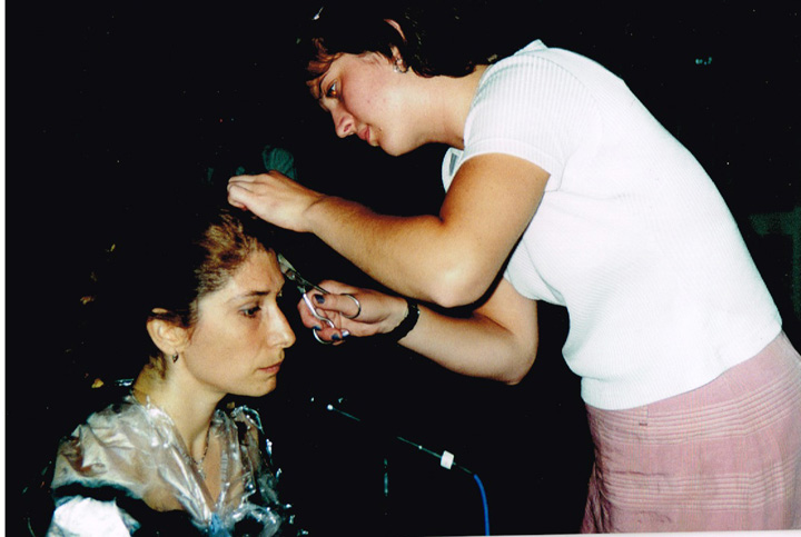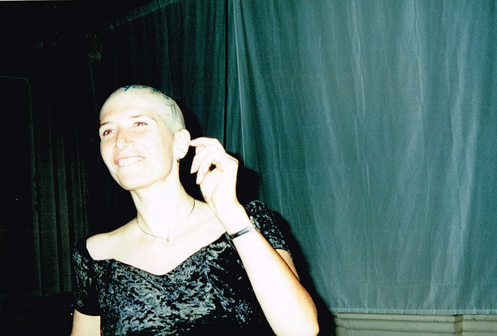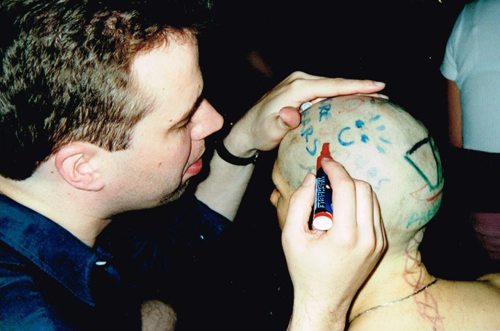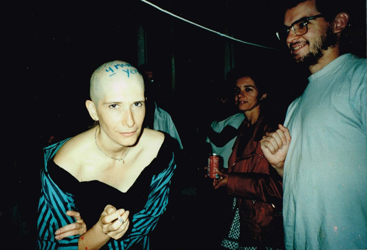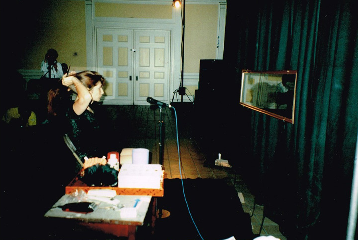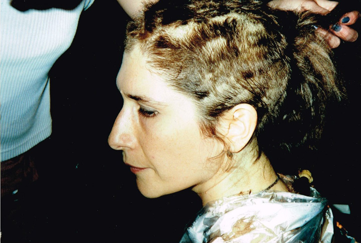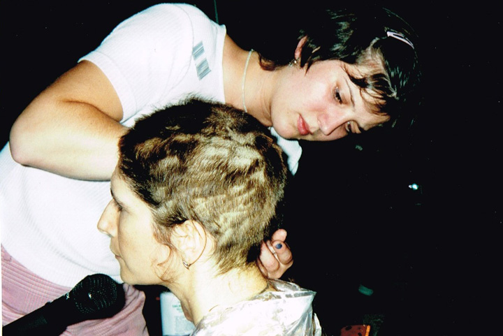 The first shaving performance in Western Hemisphere was at the Cleveland International Performance Art Festival that usually ran in April. Irina Danilova was initially invited to make a Bus 59 trip performance (59 people on bus number 59 along Ohio Route 59 with speed 59 km/h). In the beginning of the year the curator of the festival, Thomas Mulready, announced that the festival was postponed to the end of August. The Quadrennial Shaving Performance just fit in and was welcomed along with Bus Trip 59. Someone in the performance audience mentioned the miracle of the date shift. Next year's festival was again held in April. The Shaving was organized as a scripted performance with a lottery among the audience that was afterwards invited for the first time to sign the newly shaved head. A friend from New York, Sue Muskat, made BRAID#3, and cut it off with Amy, a member of the audience who won the lottery.