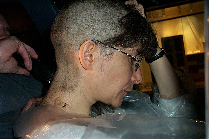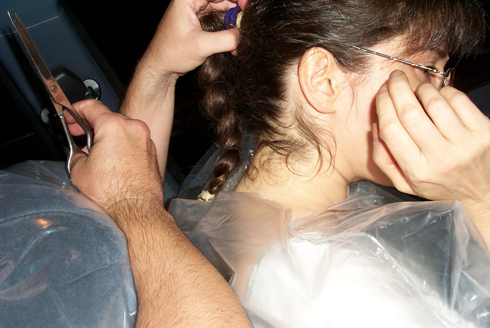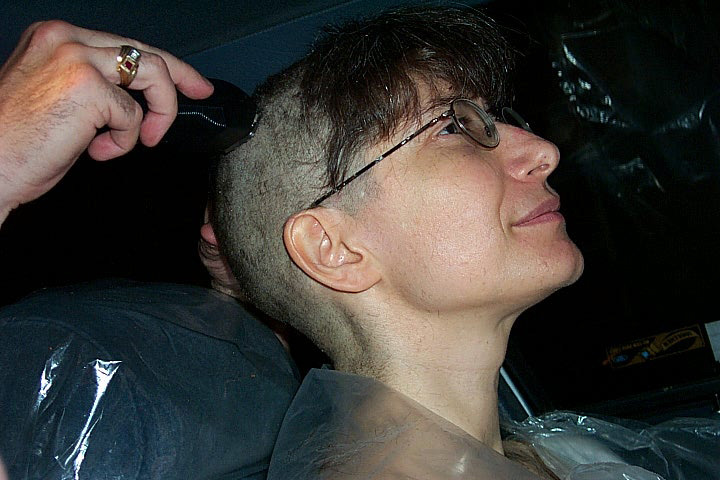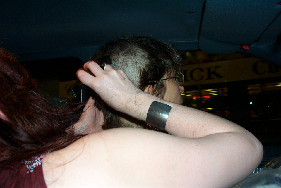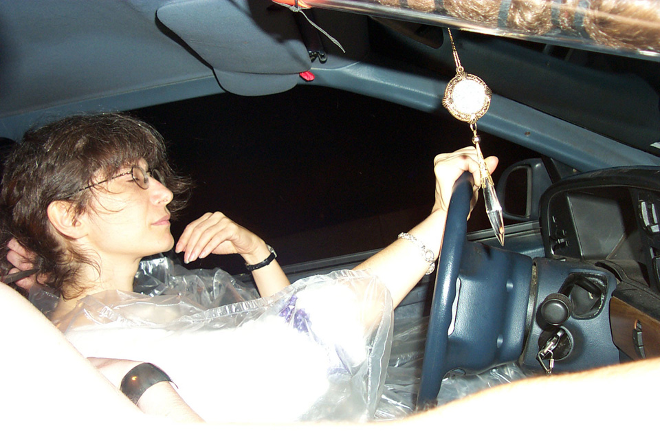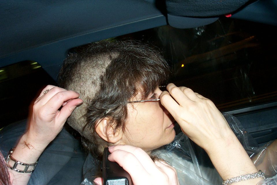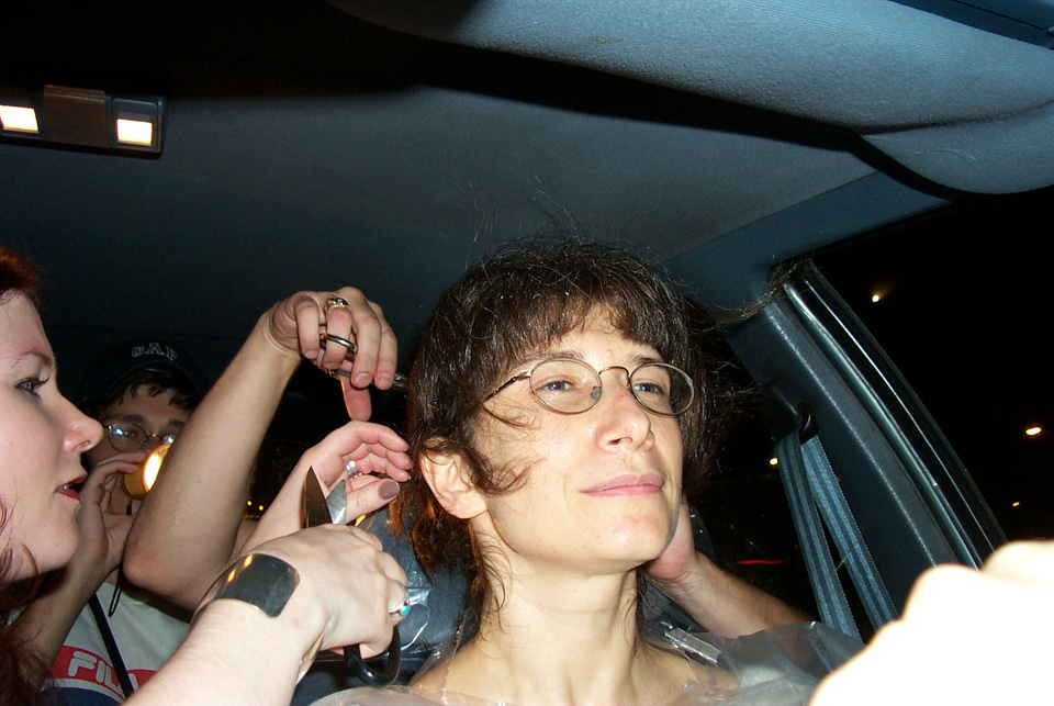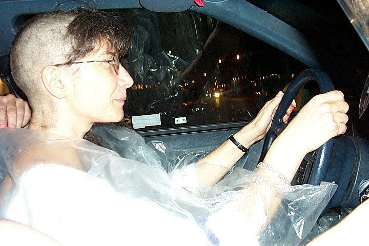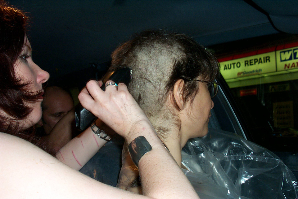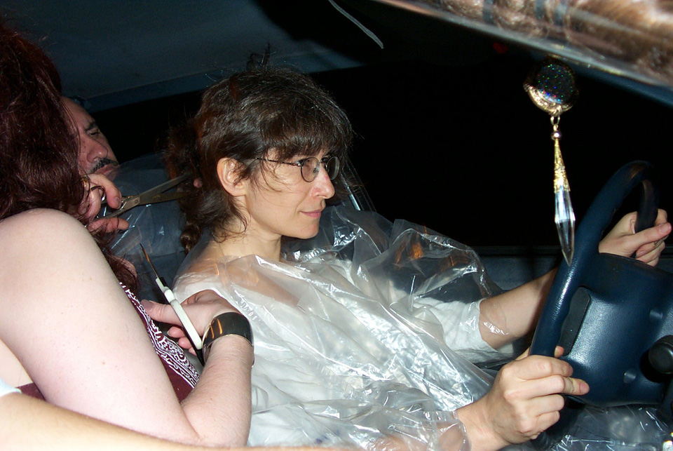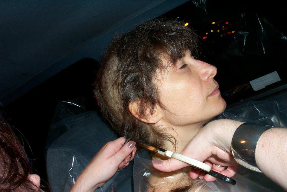 In 2000 the Quadrennial Shaving Performance was held in the car, in memory of the 7 hour drive (a half year earlier) from New York to Cleveland to say a final good-by to Irina's father, Aleksander Brikker. BRAID#4 was cut while driving the car from Irina's apartment in The Bronx (2059 Colonial Ave.) to the East Village Cafe Yaffa (beautiful). There were 5 passengers in the car: Catherine McGregor (UK) and John Badami (Staten Island) cut the driver's hair; Aleksey Danilov (video) and his friend Sergei (photo) documented the performance; Ignat Ayzenberg held a flash light. In the Cafe Yaffa all 4 braids were stacked on top of each other creating a braid column from the table top to the ceiling. Irina's newly bald head was decorated with fluorescent markers and illuminated by black light provided by Aleksey Danilov. |