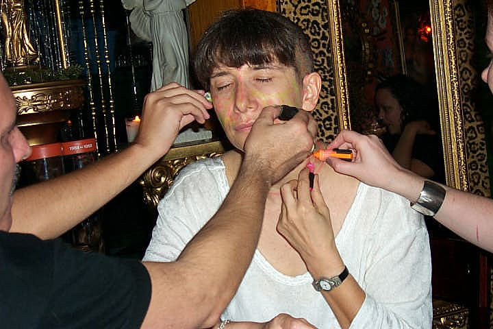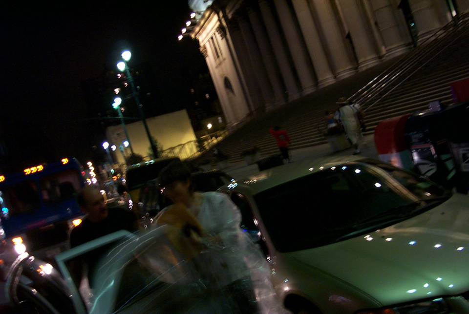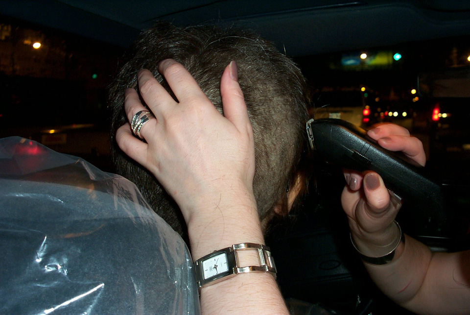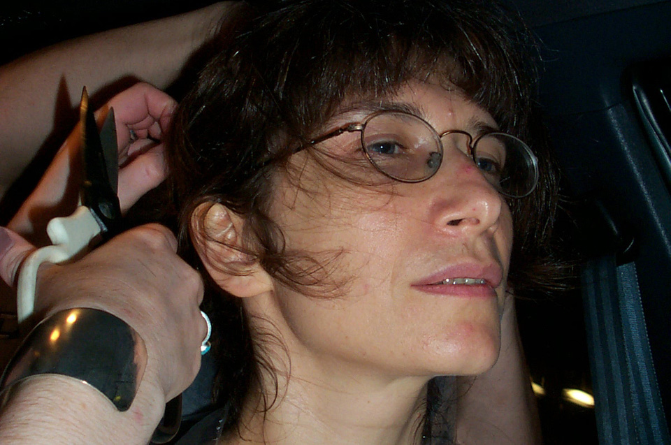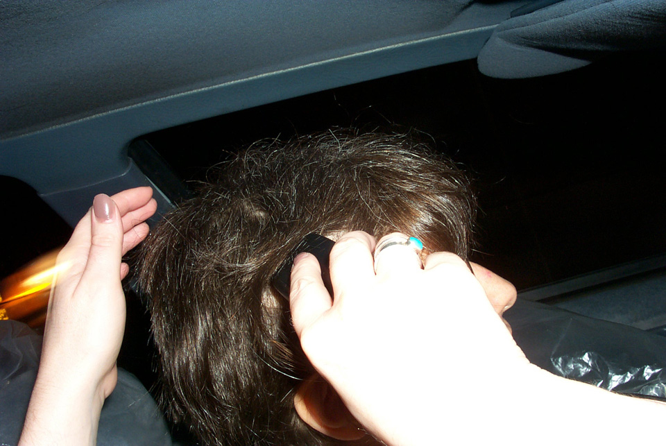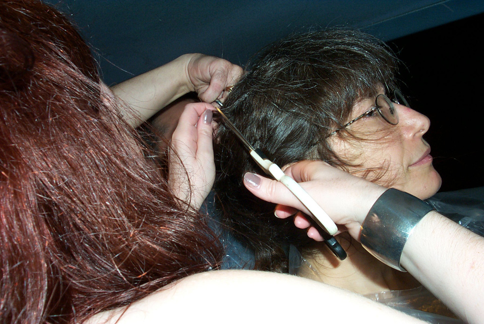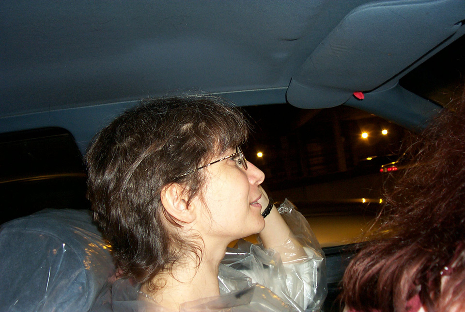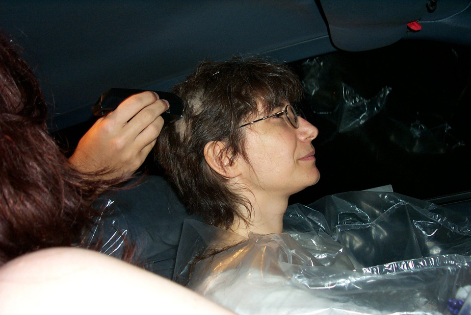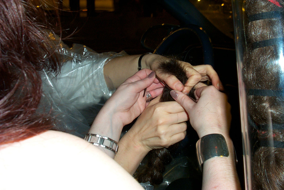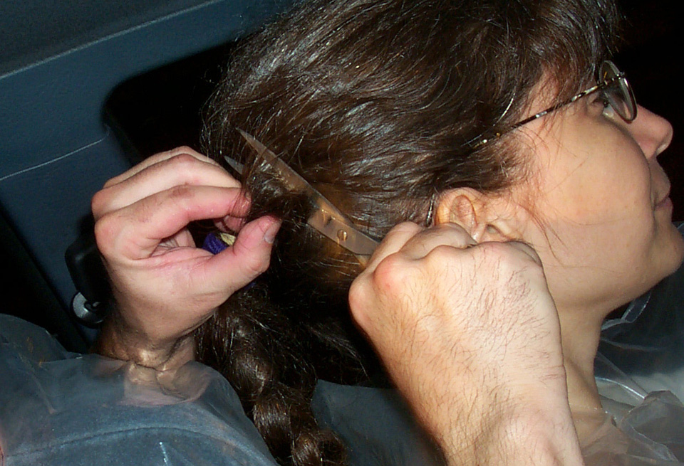 In 2000 the Quadrennial Shaving Performance was held in the car, in memory of the 7 hour drive (a half year earlier) from New York to Cleveland to say a final good-by to Irina's father, Aleksander Brikker. BRAID#4 was cut while driving the car from Irina's apartment in The Bronx (2059 Colonial Ave.) to the East Village Cafe Yaffa (beautiful). There were 5 passengers in the car: Catherine McGregor (UK) and John Badami (Staten Island) cut the driver's hair; Aleksey Danilov (video) and his friend Sergei (photo) documented the performance; Ignat Ayzenberg held a flash light. In the Cafe Yaffa all 4 braids were stacked on top of each other creating a braid column from the table top to the ceiling. Irina's newly bald head was decorated with fluorescent markers and illuminated by black light provided by Aleksey Danilov. |