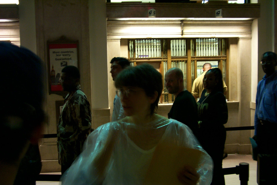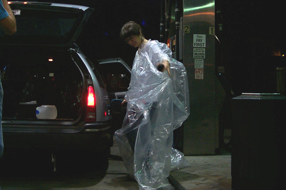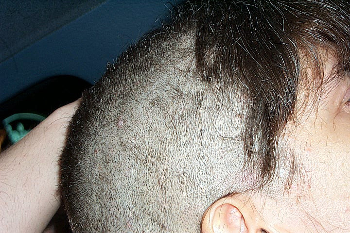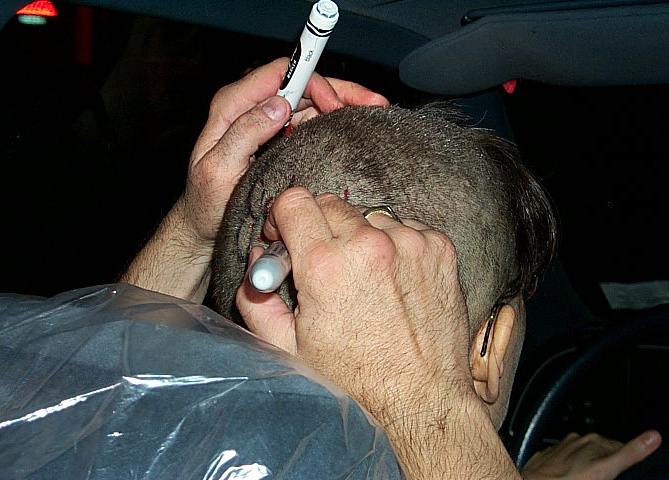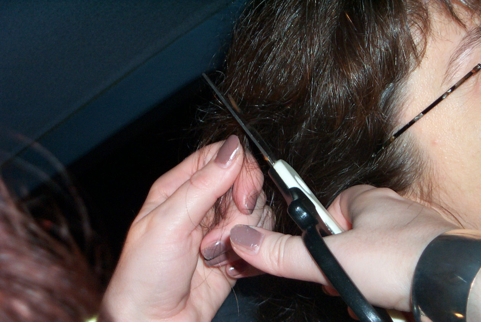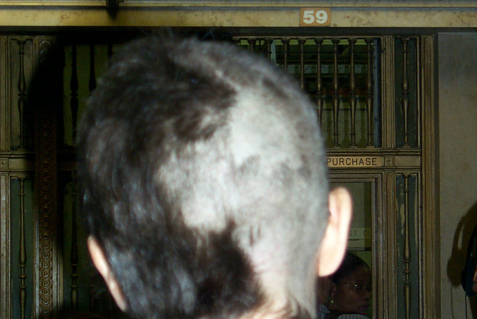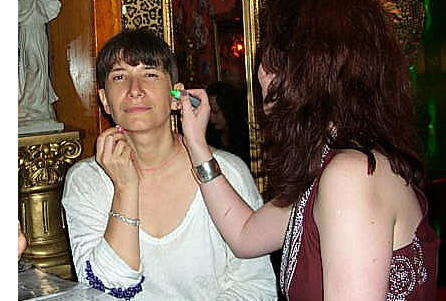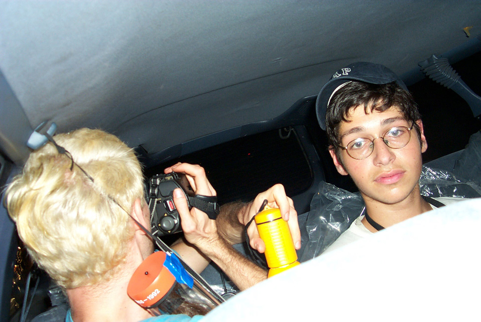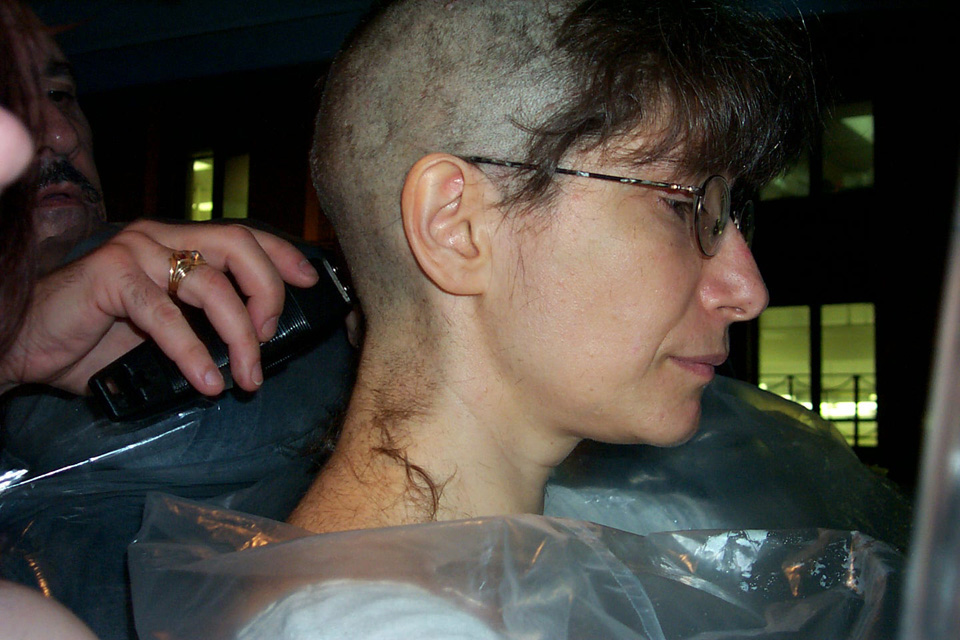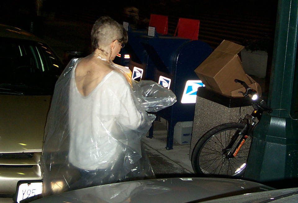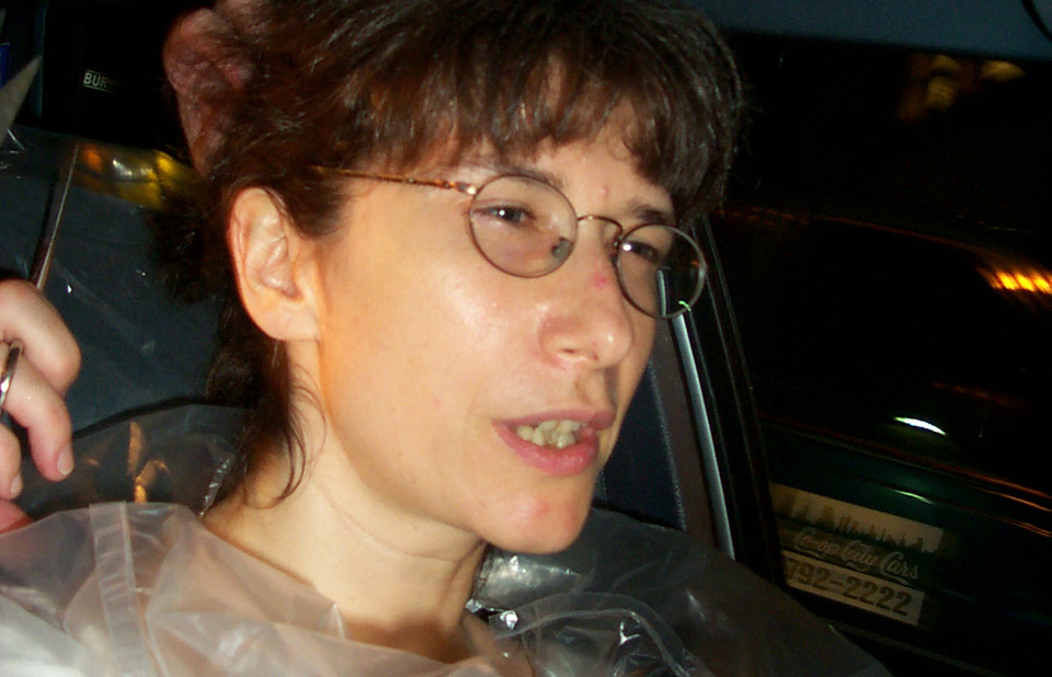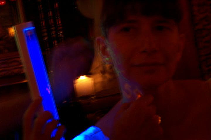 In 2000 the Quadrennial Shaving Performance was held in the car, in memory of the 7 hour drive (a half year earlier) from New York to Cleveland to say a final good-by to Irina's father, Aleksander Brikker. BRAID#4 was cut while driving the car from Irina's apartment in The Bronx (2059 Colonial Ave.) to the East Village Cafe Yaffa (beautiful). There were 5 passengers in the car: Catherine McGregor (UK) and John Badami (Staten Island) cut the driver's hair; Aleksey Danilov (video) and his friend Sergei (photo) documented the performance; Ignat Ayzenberg held a flash light. In the Cafe Yaffa all 4 braids were stacked on top of each other creating a braid column from the table top to the ceiling. Irina's newly bald head was decorated with fluorescent markers and illuminated by black light provided by Aleksey Danilov. |