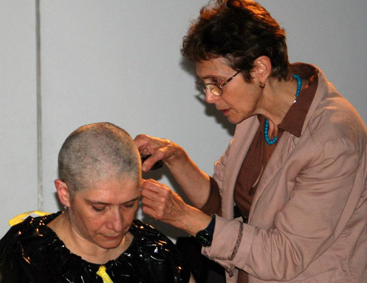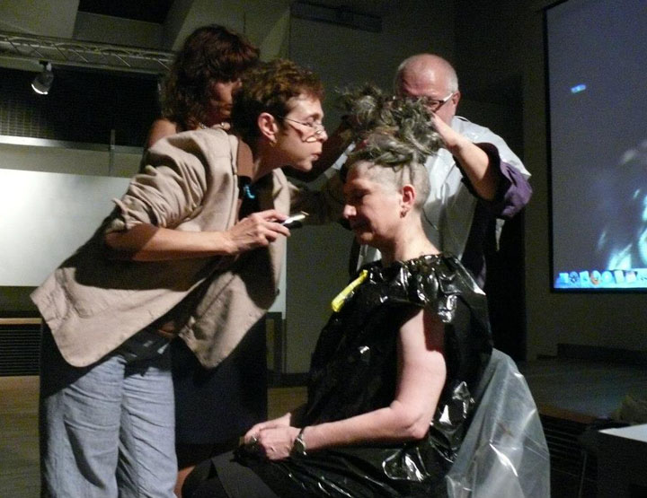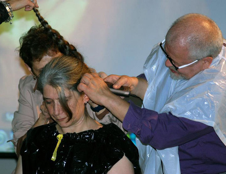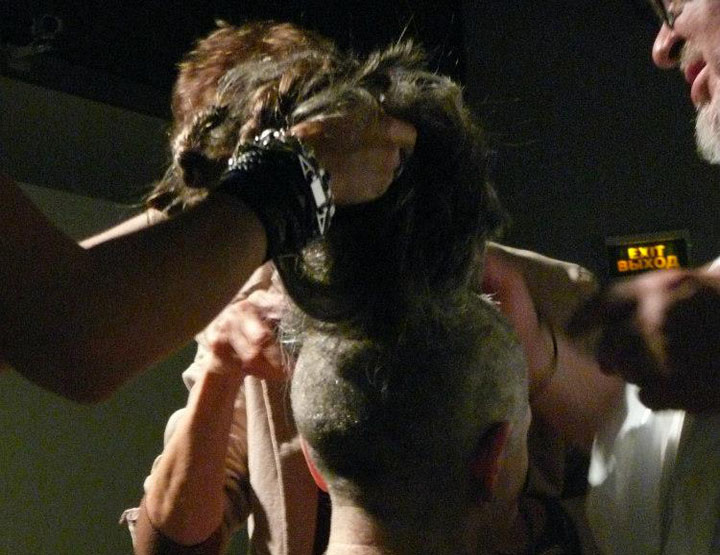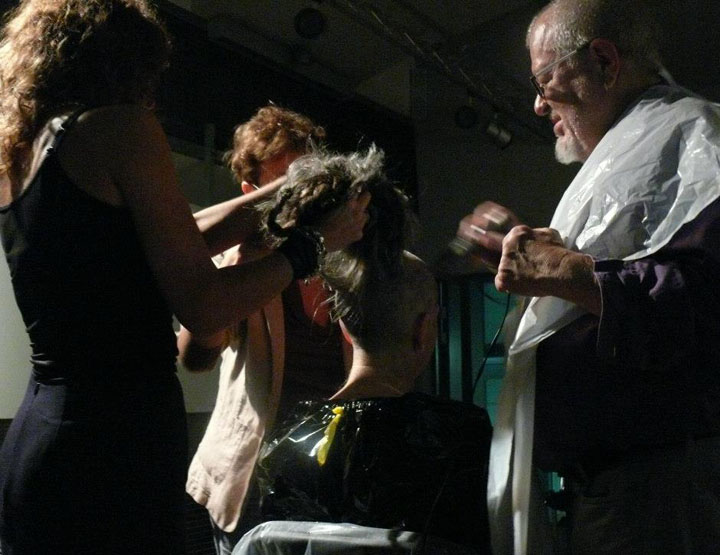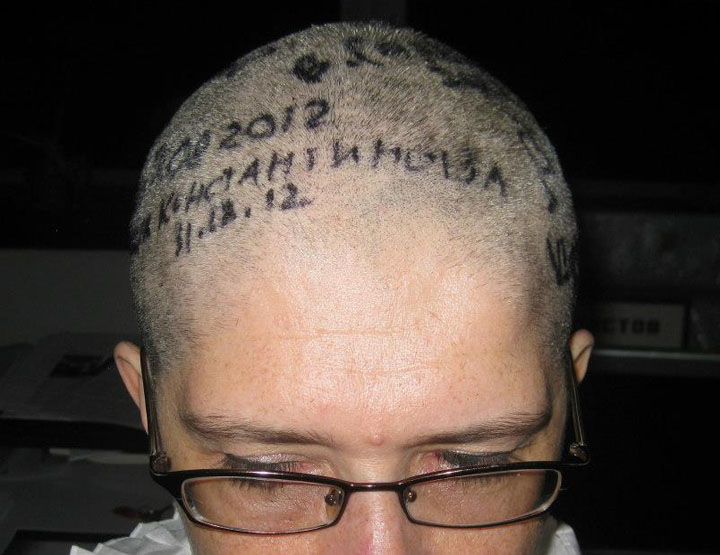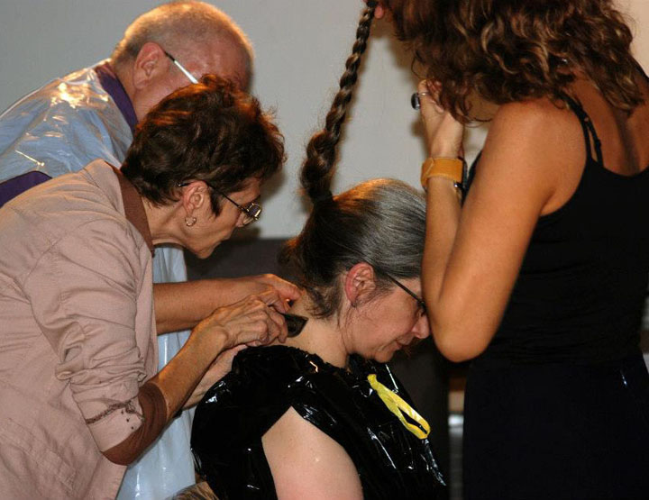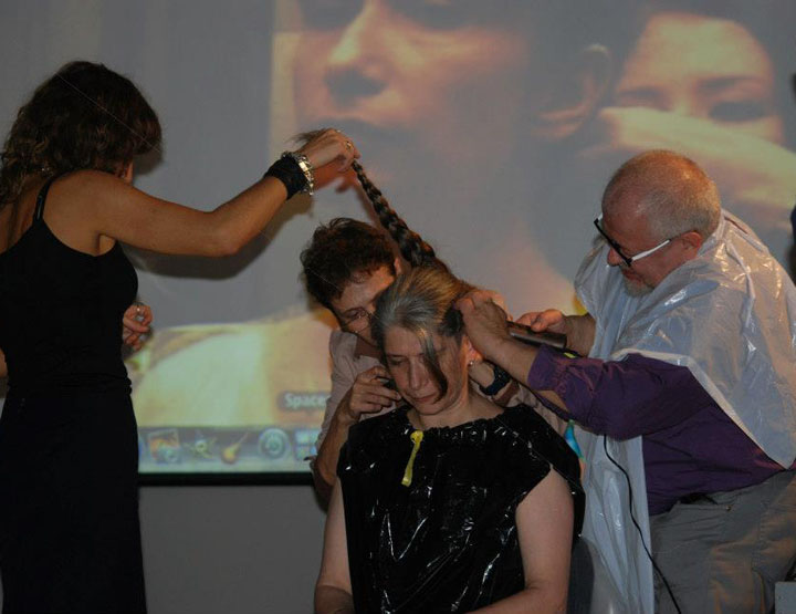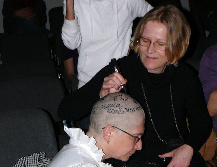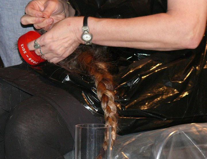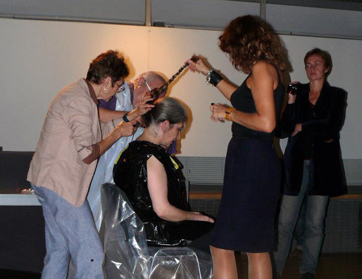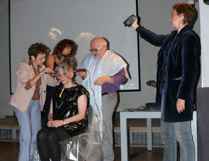 In 2012 The Quadrennial Shaving Performance was invited by Irina Gorlova and Leonid Bazhanov to the National Center for Contemporary Art in Moscow, 20 YEARS AFTER the Shaving for America, farewell performance in Moscow in 1992. Angelina Panova, Rostislav Egorov, Vladimir Salnikov and Nina Kotel, who attended the 1992 shaving in Moscow, were involved again. Angelina made the braid and Rostislav took pictures as they did 20 years before. Vladimir and Nina cut BRAID#7. Curator: Natalya Goncharova. |
