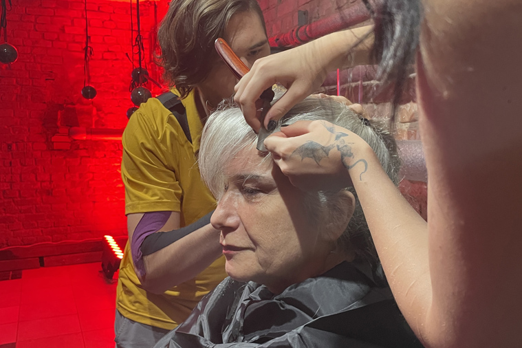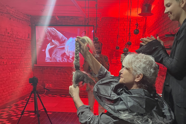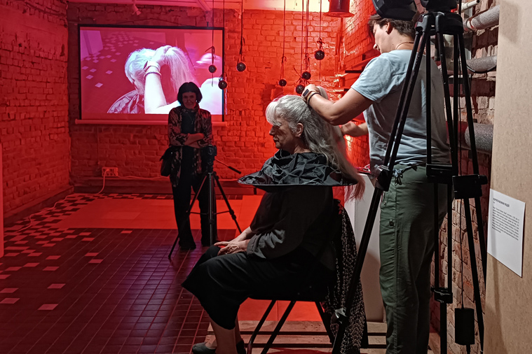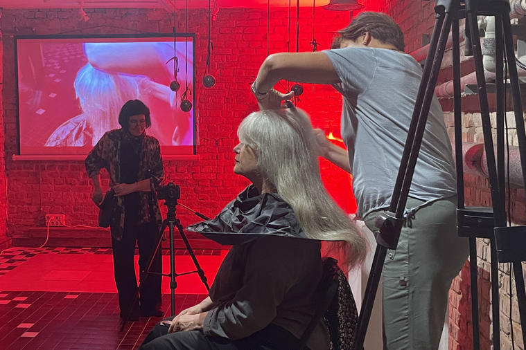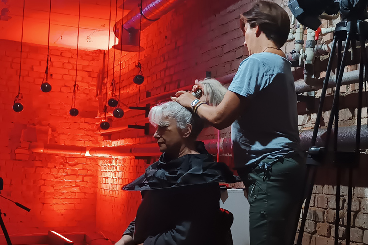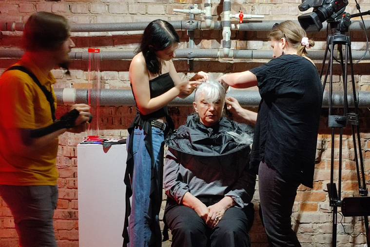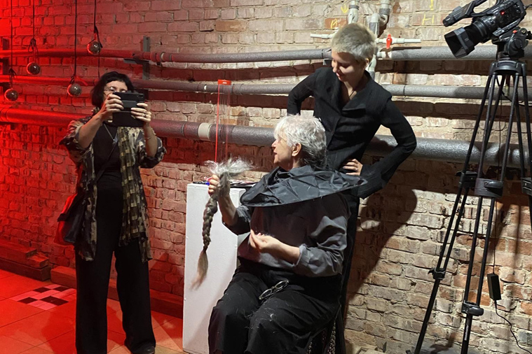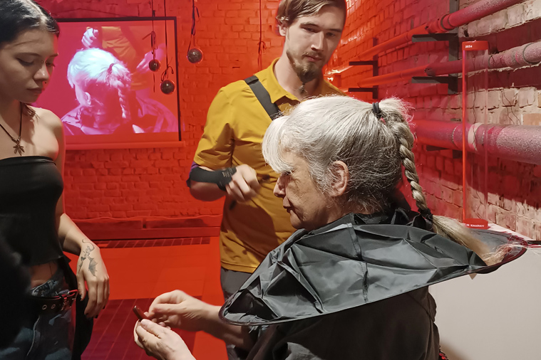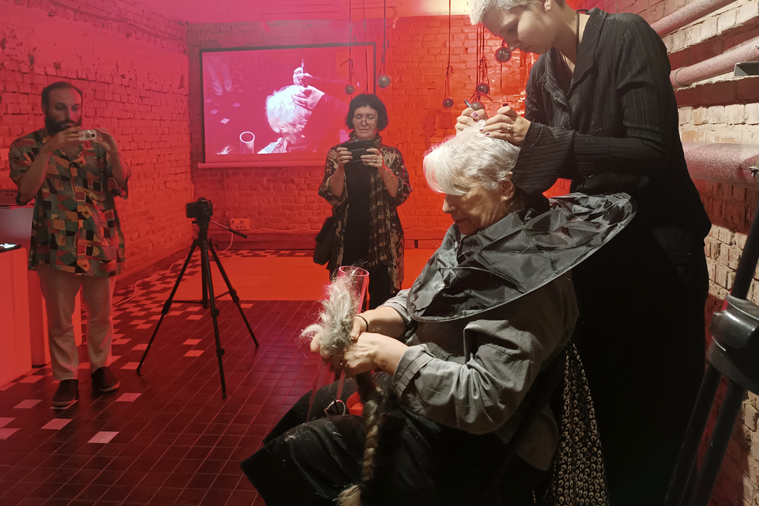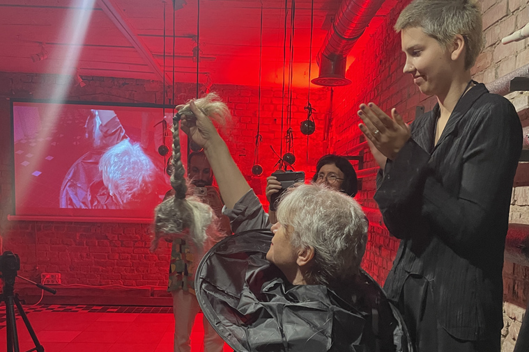 Participants: Irina Danilova (performer), Olena Makhotilo (braider), Maria Kvitma (presenter and haircutter), Maks Mokritsky (haircutter), Sofia Kompaniets (haircutter), Daryna Kosichenko (photographer and haircutter). Photos by Mikhailo Kvitka and Daryna Kosichenko.